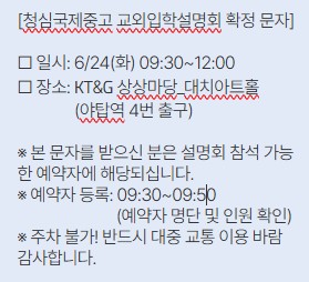 | ¡Ø ¿¹¾àÀÚ Âü¼® ºÒ°¡ÇÑ °æ¿ì, 6/20(±Ý) 14½Ã±îÁö ¹Ýµå½Ã º»±³·Î ÀüÈ Ãë¼Ò(031-589-8888) ´ë±âÀÚÀÇ °æ¿ì, ¿¹¾àÀÚ Ãë¼Ò¿¡ µû¶ó ¼øÂ÷ÀûÀ¸·Î 6/23(¿ù)±îÁö Âü¼®À¯¹« °³º° À¯¼± ¾È³» ¡Ø ¿¹¾àÀº Æò±Õ 30ÃÊ À̳» ¸¶°¨µÇ¹Ç·Î ¹Ýµå½Ã ¼±Âø¼ø ¿¹¾àÀϽà ¹× ½ÅÃ»È¸é »çÀü È®ÀÎ ÇÊ¿ä (Âü¼® ÀοøÀÌ Á¦ÇѵǹǷΠÁߺ¹ ½Åû ½Ã, ¿¹¾à Ãë¼Ò) ¡Ø Çб³ »çÁ¤¿¡ µû¸¥ ÀÏÁ¤ º¯°æ ½Ã, ȨÆäÀÌÁö¸¦ ÅëÇØ ¼öÁ¤ °øÁö |
